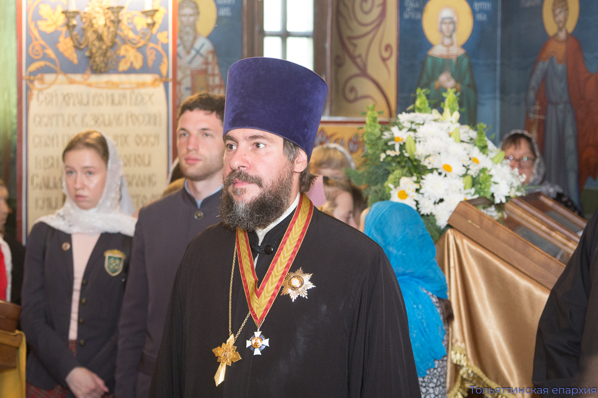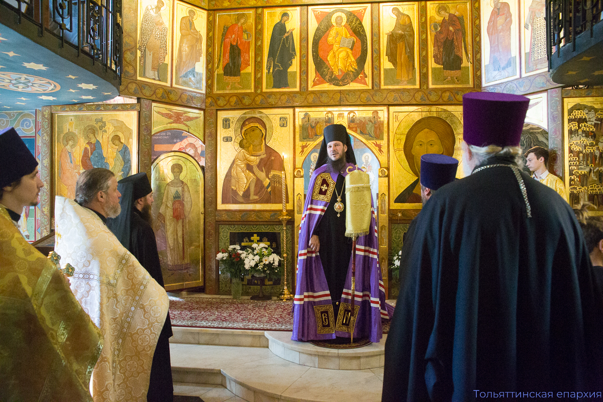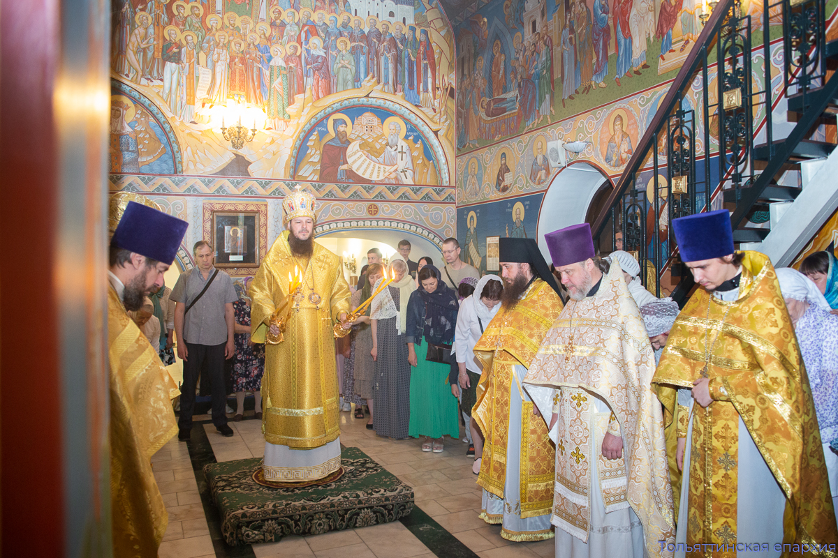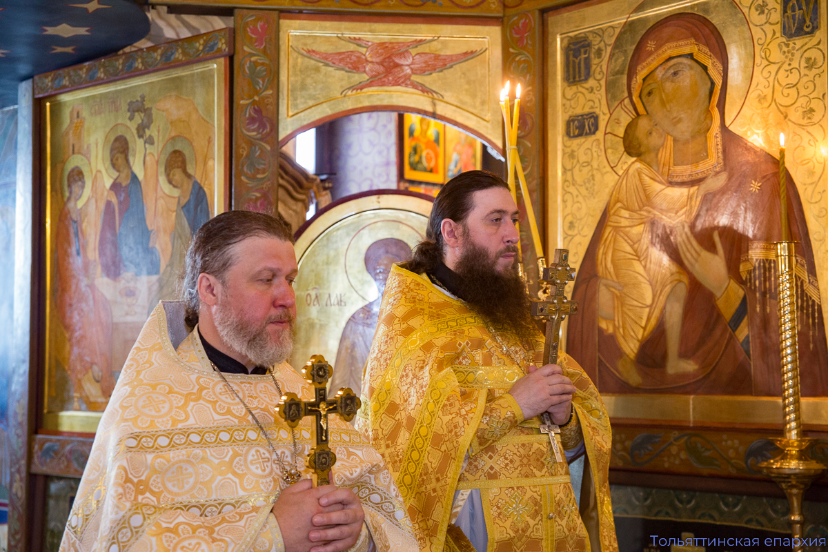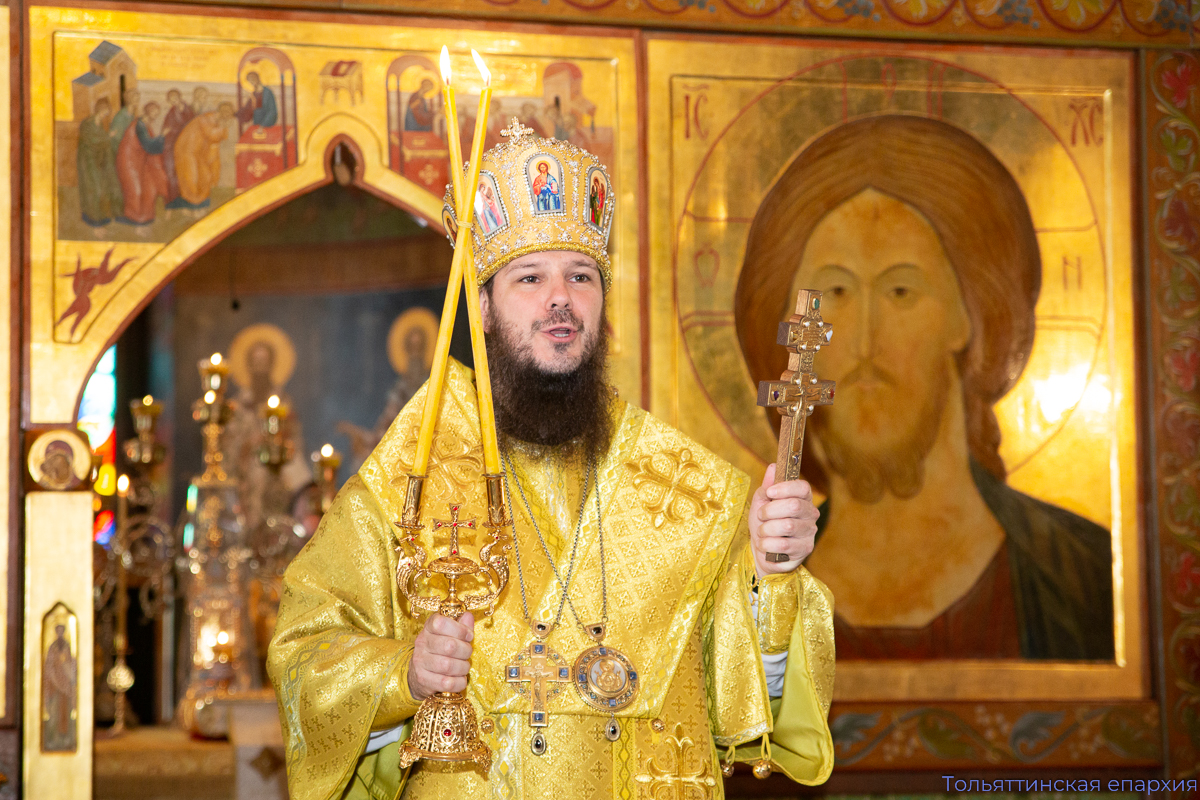 Преосвященному владыке сослужили: благочинный Центрального округа Тольяттинской епархии протоиерей Николай Манихин, благочинный Преображенского округа Тольяттинской епархии иеромонах Питирим (Чембулатов), настоятель храма во имя Всех святых, в земле Русской просиявших, протоиерей Димитрий Лескин, настоятель Успенского храма Тольятти протоиерей Иоанн Ермаков, благочинный Тихоновского округа Тольяттинской епархии протоиерей Андрей Матвеев, клирик храма во имя Всех святых, в земле Русской просиявших, иерей Никита Рыбаков. В диаконском чине служили клирик Преображенского кафедрального собора Тольятти диакон Артемий Панков и клирик храма во имя Всех святых, в земле Русской просиявших, диакон Владислав Трофимов.
