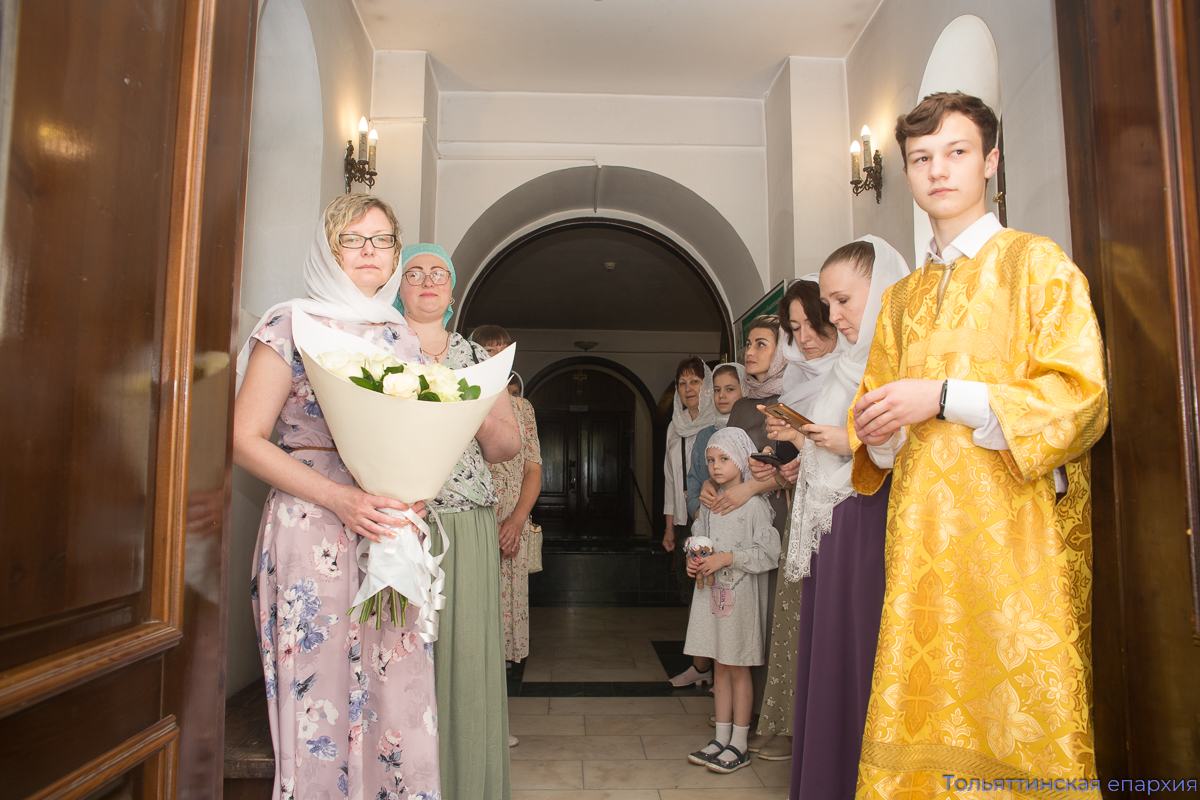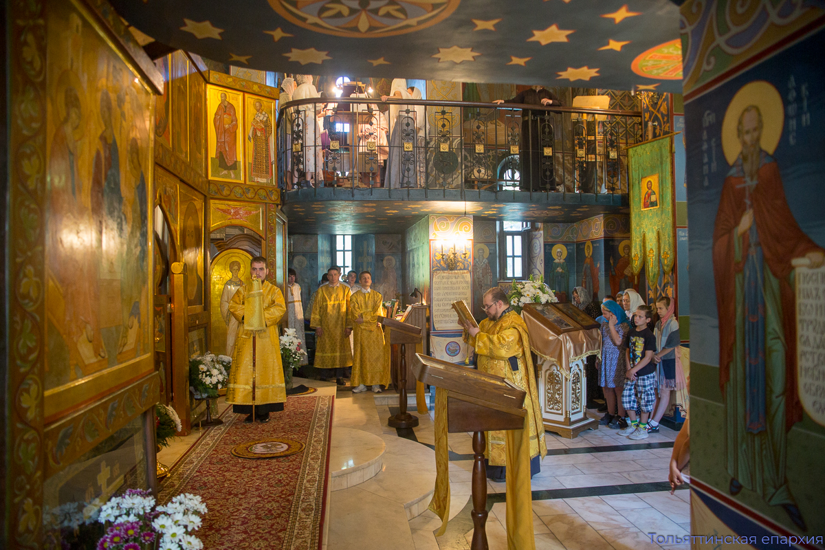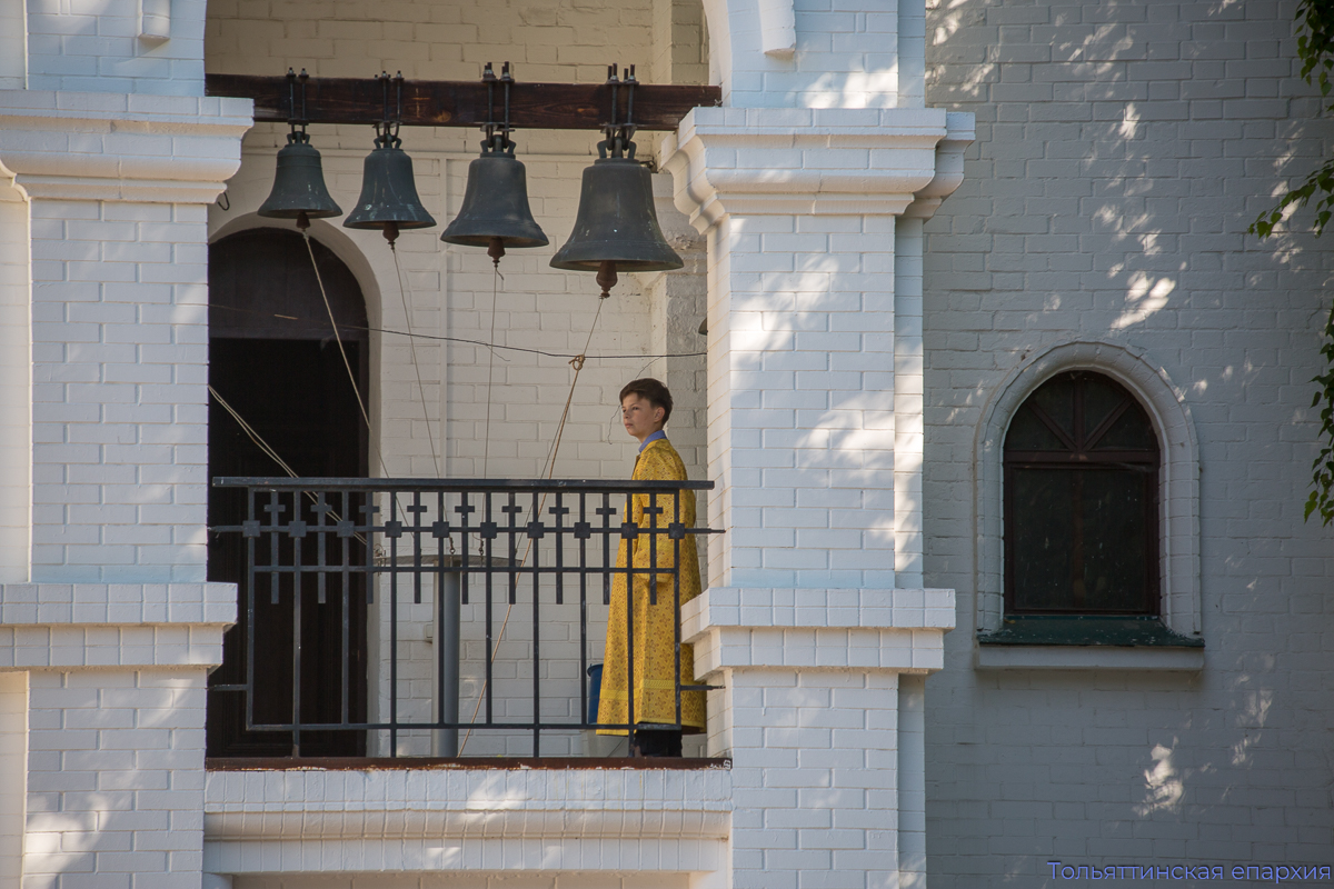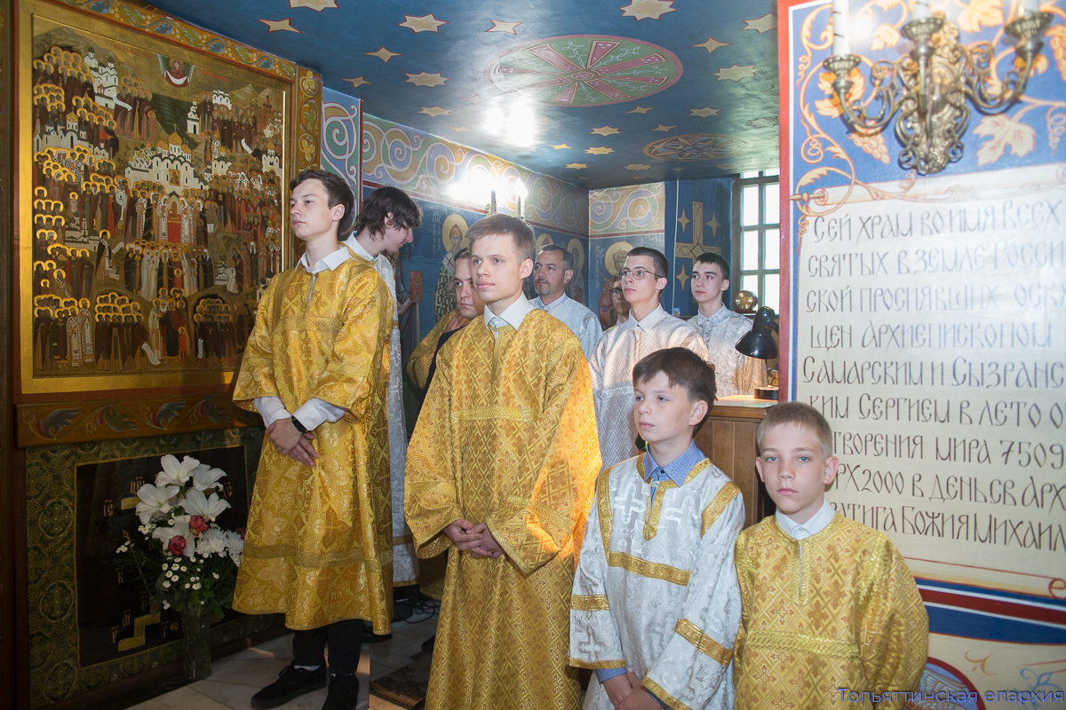 Богослужение сопровождали два певческих коллектива: девичий хор храма во имя Всех святых, в земле Русской просиявших, под управлением Елены Вишняковой и хор юношей «Алконост» под управлением Ивана Макеева. Вместе с архиереем и духовенством молились администрация, учащие и учащиеся Православной классической гимназии, Гуманитарного колледжа им. Святителя Алексия, Поволжской академии образования и искусств Тольятти, прихожане и паломники.